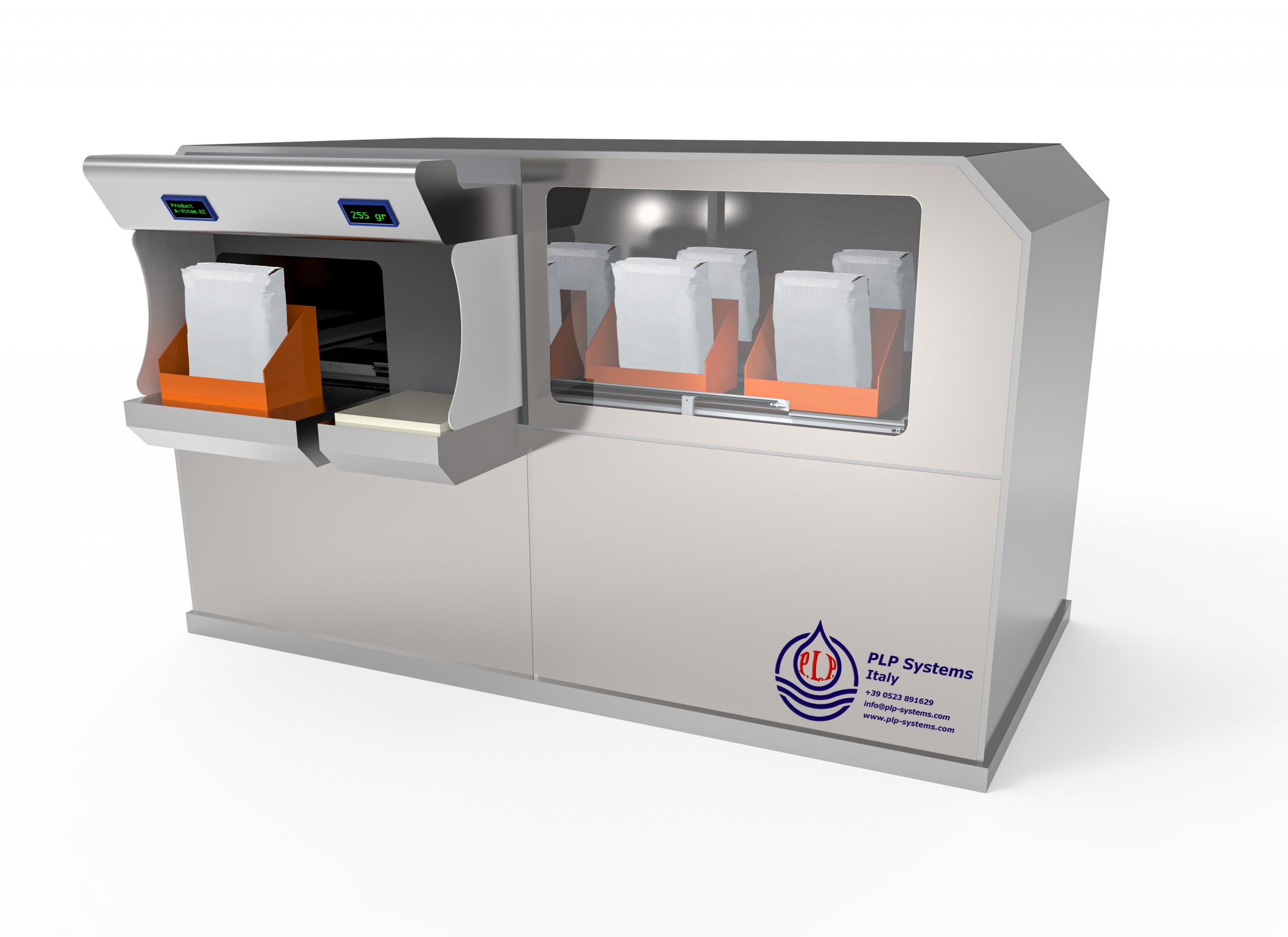 The various powder components, contained in bags, are placed in boxes with containment sides. Each box has its identification address. The control system includes a PLC Touch with the display of the programmed recipes, the required weight, the actual weight, data storage, operator traceability management, date and recipe. The internal movement of the bags is automatic, based on the request of the programmed recipe.