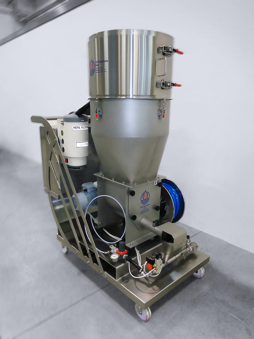 La unidad esta montada sobre un carro compacto, ideal para moverla por la planta. La tolva de almacenamiento está provista de un filtro de aspiración HEPA que se pone en funcionamiento durante el llenado manual del polvo. Un preciso dosificador a rosca alimenta el polvo en un eyector Venuti y desde allí el polvo se distribuye por toda la línea de proceso.