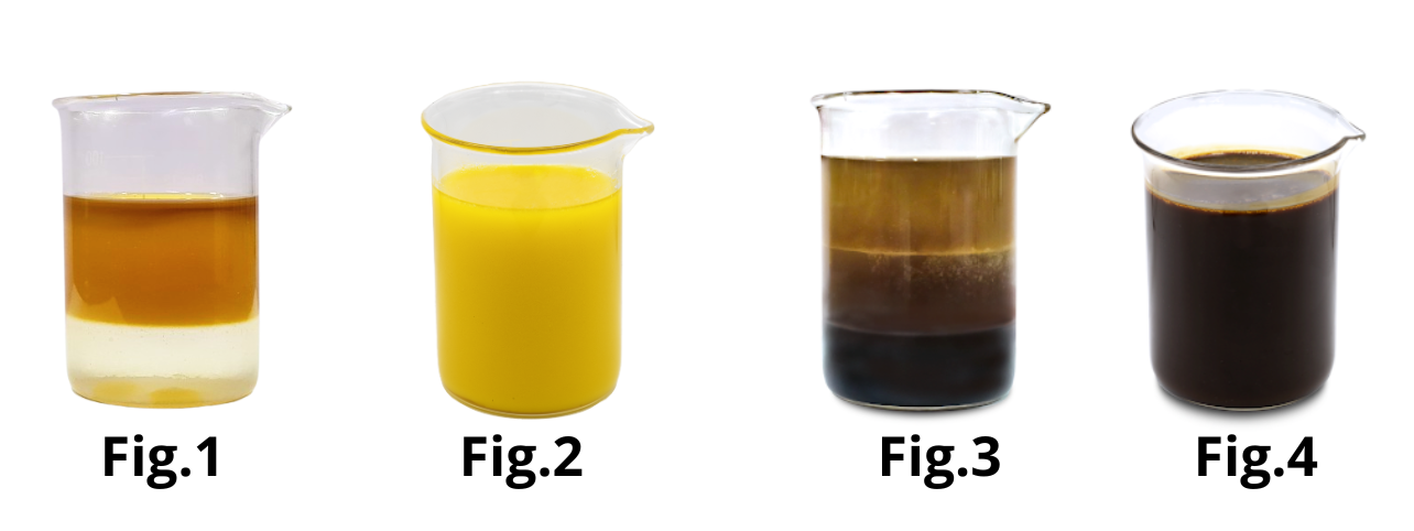Fig. 1-2, 70% vegetable oil; 30% H₂O. Fig. 3-4, 40% molasses, 40% vegetable oil, 20% H₂O. Comparision of liquid feed separation times. The sample on the left was obtained using a traditional mixer, while the one on the right was obtained using our EML Homogenizer.
